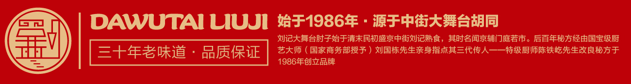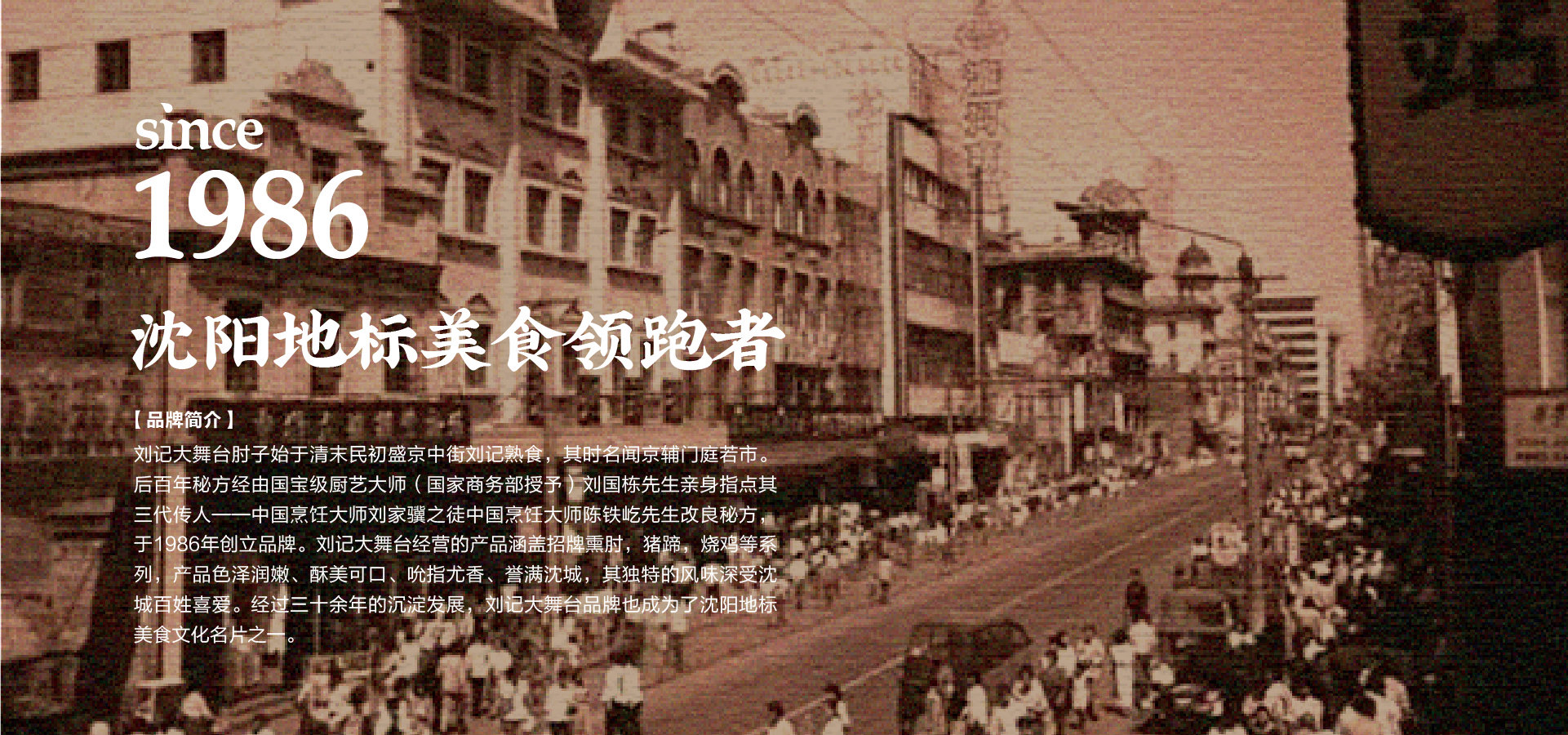 盛京,昔乃大清王朝發(fā)祥之地。劉記大舞臺(tái)肘子始于清末民初盛京中街劉記熟食,其時(shí)名聞京輔門庭若市。后百年秘方經(jīng)由國(guó)寶級(jí)廚藝大師(國(guó)家商務(wù)部授予)劉國(guó)棟先生親身指點(diǎn)其三代傳人——中國(guó)烹飪大師劉家驥之徒中國(guó)烹飪大師陳鐵屹先生改良秘方,于1986年創(chuàng)立品牌。劉記大舞臺(tái)經(jīng)營(yíng)的產(chǎn)品涵蓋招牌熏肘,豬蹄,燒雞等系列,產(chǎn)品色澤潤(rùn)嫩、酥美可口、吮指尤香、譽(yù)滿沈城,遂成古今絕味,其獨(dú)特的風(fēng)味深受沈城百姓喜愛。經(jīng)過三十余年的沉淀發(fā)展,劉記大舞臺(tái)品牌也成為了沈陽地標(biāo)美食文化名片之一。